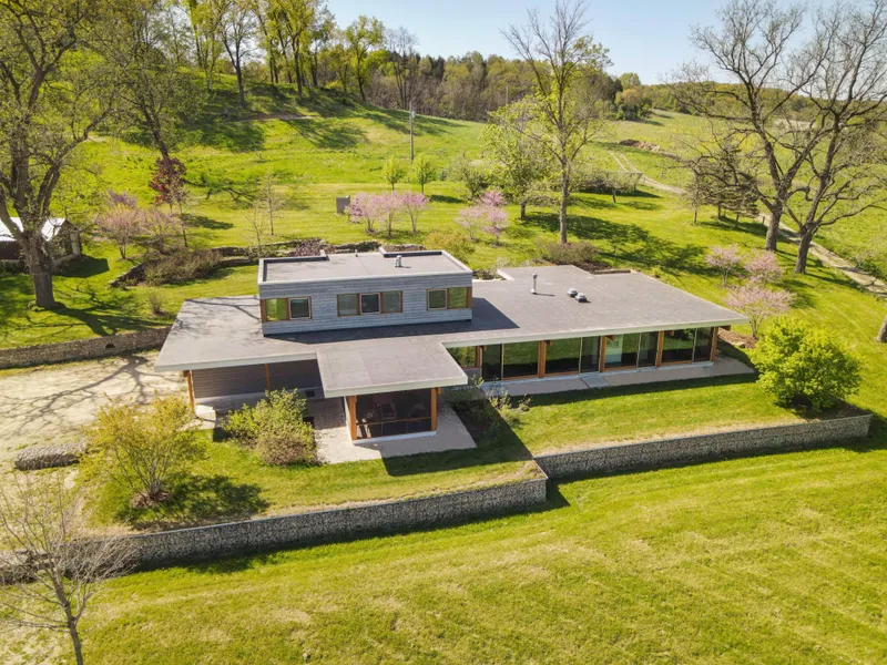 Positioned amongst the rolling hills of Spring Green Wisconsin across the road from Taliesin, this graceful, modern home designed by Chicago's Wheeler Kearns is a true gem in the heart of the Driftless region. 2 hours west of Milwaukee on 78 Acres of fields and forest, the home's artful presence provides a spectacular setting for contemporary living. Walls of windows offer panoramic views connecting you with the breathtaking natural surroundings. The home features an easy flowing plan, with an oversized gourmet kitchen, high-end finishes, heated floors throughout and a tranquil three season porch. Geothermal heating and cooling, as well as a solar array allow for sustainable living, while farm-ready infrastructure, a pond, oak savannas and walking trails complete a full rural experience.