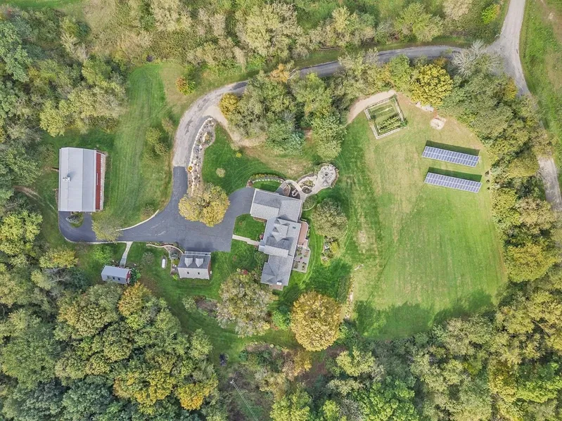 EXCEPTIONAL 40-ACRE DRIFTLESS REGION FARMHOUSE ESTATE. Step into the kitchen & try not to swoon. Quartz counters, cabinets for days, a dining bar for easy entertaining, all flowing into a dining room with its own beverage center. Those gorgeous wood floors? Real vintage planks that tell stories. The main floor primary suite is perfect w/fireplace, spa bathroom (heated floor) & a walk-in closet w/fabulous built-ins. (Fun fact: talented Amish craftsmen worked their magic throughout this home!) Upstairs you'll find a grand bedroom, storage galore, a full bath w/custom shower + vintage tub, plus an office & craft nook. Downstairs? Prepare to fall in love with an artistic wine room, plus flex spaces for whatever makes you happy. The sunroom overlooks a new water feature. The 1921 "granary" has