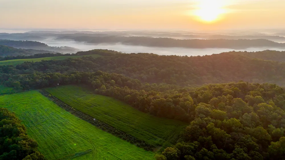 -Rolling hardwood ridges with mature oaks, maples, and walnuts