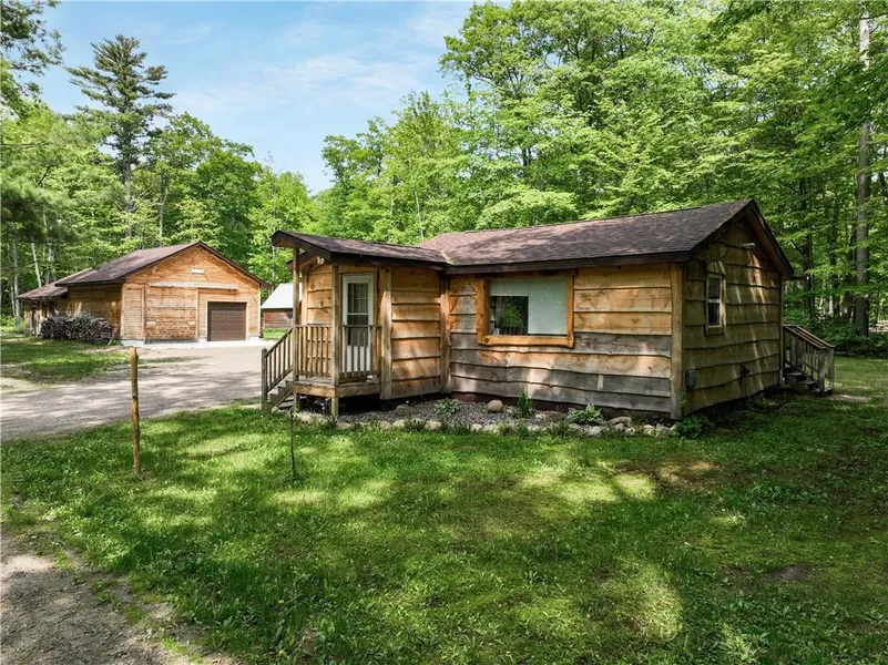 Looking for your happy place? Situated on 1.23 acres, this 1 bed, 1 bath may be small, but the benefits are huge! Location does not get any better than this. Why be on one lake when you can be surrounded by them! A mere 1.4 miles down the road takes you to the nearest public boat launch and beach on Grindstone Lake or 1.7 miles to the public boat landing at Lac Courte Oreilles Lake. Made with love, this home has custom wood features throughout with a new roof, water heater and furnace in 2021. Be the talk of the town! The custom wood siding makes this one of the most unique and beautiful properties you will see. The 28 x 48, 1,460 sq ft heated garage was built in 2020 and has so much extra opportunity. With a few steps, this could be walled off and made into an additional living space. Includes a half bath, office area, set up for EV charge, 200-amp service and cable and Internet ready. Electric for garage and house are separate with shared conventional septic system.