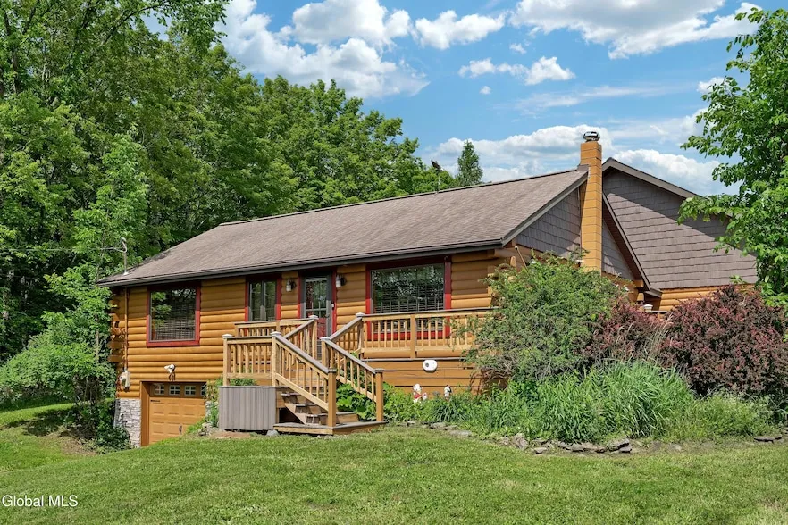 Discover your ultimate country retreat! This fully furnished 4-bed, 3.5-bath log home on 10.5 private acres blends rustic charm and modern comfort ideal as a sanctuary or Airbnb. Enjoy natural wood interiors, vaulted ceilings, a cozy wood fireplace, and skylights in the open living/dining area. Large eat-in kitchen. Two primary suites. Finished basement offers a game room, office, living area, and bath. Outdoor living shines on a tiered deck with kitchen and gazebo. Amenities include a garage, wood furnace, new 2-zone HVAC, water filtration/UV, and a whole-house generator. Excellent condition! Near Windham/Hunter. This turnkey escape is a must-see!