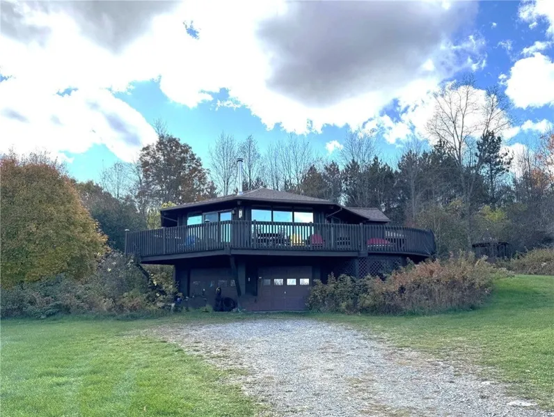 This unique octagonal-shaped contemporary home is poised on 70 acres of your own private woodlands and surrounded on 3 sides by the 9,000-acre Sugar Hill State Forest. Twenty-two floor to ceiling windows give this home an unmatched indoor-outdoor feel, complemented by soaring cathedral ceilings and a view across the valley that goes on for miles. Step out onto the wrap around deck to enjoy the expansive views or steep in the beautiful cedar hot tub, sunk into the deck. The living space and kitchen area face due east towards the sunrise and offer a wonderful open concept. Three bedrooms, two full baths, a small sunroom, and laundry – conveniently located in the hallway that leads to the bedrooms. The Primary bedroom has plenty of space and large windows to enjoy the outdoors, as well as direct access to the Hall bathroom. The other two bedrooms are across the hallway, and both also have large windows and closets. Below the kitchen area is a utility room and 2 bay garage. Lots of thoughtful updates include new radiant floor heat (2022) in the bedrooms and back bathroom, and a new roof (2021). Two energy efficient mini splits provide heat and cooling, baseboard heating in the living area, and an efficient Jotul wood stove further warms the living room. A whole house Generac generator is installed. Marked trails crisscross the property and hook up to trails on the state land. Nearby attractions include Seneca, Keuka, Waneta and Lamoka Lakes nearby, as well as wineries up and down the lakes, NASCAR races, and the Wind Mill Market. The seller will provide the survey dated 8/3/2010. There are some marked hiking trails on the property. Small shed for storage, and a pavilion out back.