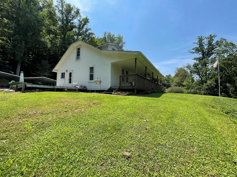 Charming home on 11 acres! Cross the bridge & follow the paved drive up the hill to this 3 bedroom one bath country home! The covered front porch w/hillside views runs along the whole front of the house. The front door opens into the living room. Behind the living room is the main bedroom, to the left of the living room is a wide opening to the dining room/ family room. In the eat- in kitchen you'll find beautiful cabinetry, newer appliances, and a door leading to the deck & flat part of the acreage- it would be a perfect place to add a pool or garden! The bathroom w/ walk-in shower is also on the first level. 2 additional bedrooms are upstairs. There are 2 carports, a partial basement, & various outbuildings.