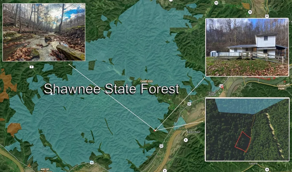 1 acre of land for sale in Scioto County, Ohio, featuring a 768 sq. ft. home that would make the perfect base camp. This property is at the end of a peaceful dead-end road with all utilities in place, including high-speed internet. One of the stand-out features of this property is its direct access to Shawnee State Forest, which spans over 63,000 acres. This state forest offers endless opportunities for hiking, hunting, fishing, and wildlife observation. This property also offers a beautiful creek that runs the entire length of the property. Don't miss the chance to make this peaceful retreat your own. Annual taxes are $1,272.17.