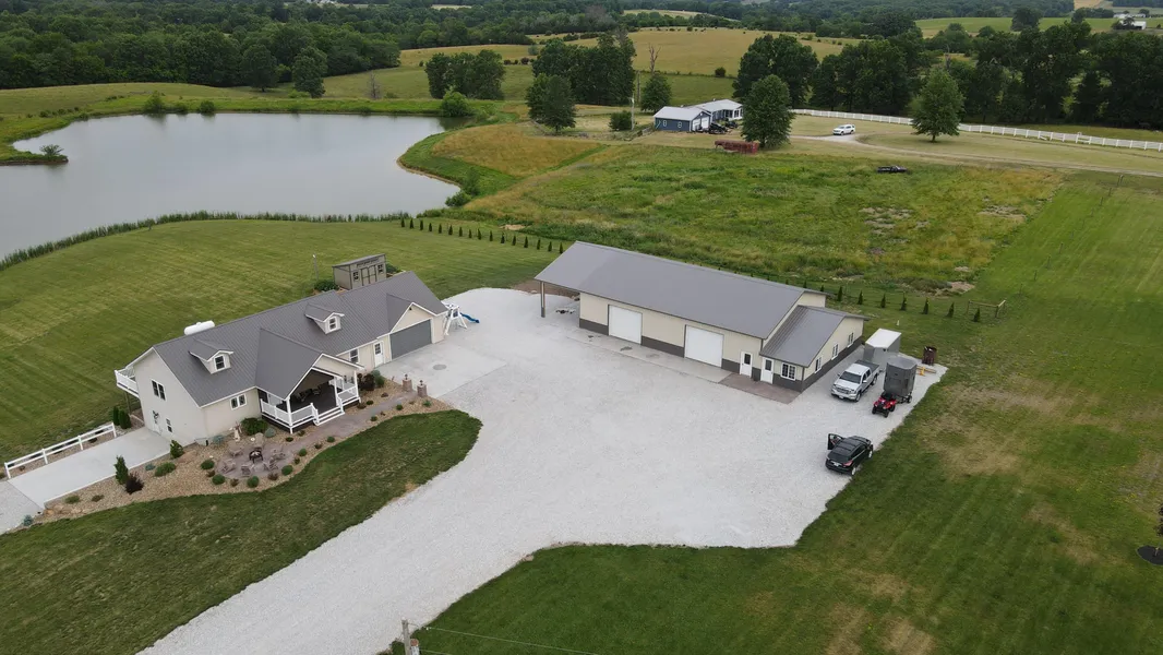 Nice area to have a shop or host events. West end of building is 40' X 16'. Would make an ideal location to store a camper under roof being west and south end is open. East end of building is 40' X 12'. Could be a possibility for an office. The property does have a view of a lake. (Lake not included with property.) Property does have a landscaped pond with a diving board. This is ...