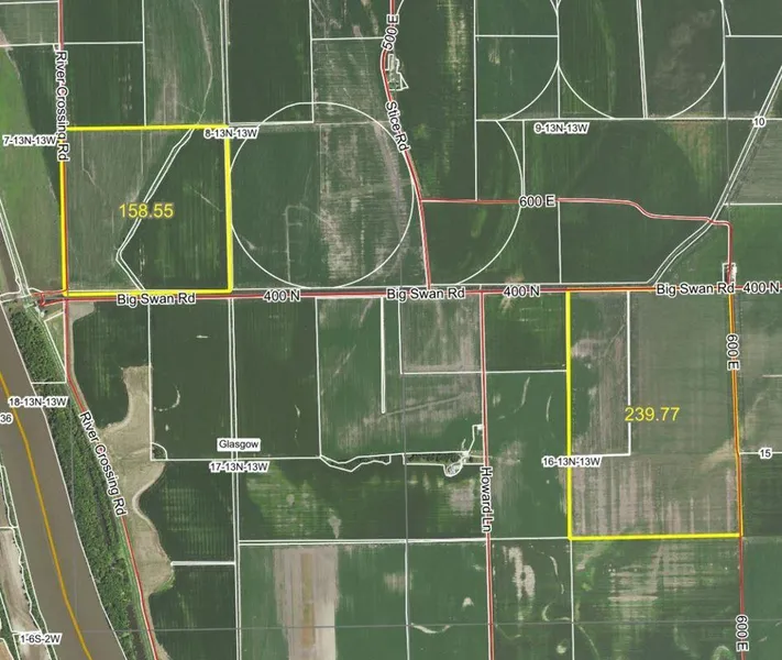 Access to the Western 158.55 acre tract: From River Crossing Road, a gravel road along the West side. The tract is separated by a drainage ditch into two fields. The Eastern field is accessed from the North.