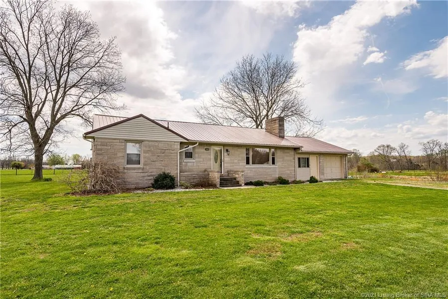 This large bedford stone ranch home sits on 3 acres in Scottsburg.. It has a brand new metal roof and has newer windows.. natural hardwood floor through out the first floor of this home! Nice custom made cabinets in the kitchen! With all kitchen appliances remaining! Large living room has a nice gas log fire place! The master bedroom features a nice master bathroom walk in jacuzzi tub, and a large closet! There is a finished room in the basement. Covered front porch and a attached garage! Only minutes from shopping and restaurants and the expressway. sq ft is approximate if critical buyers should verify