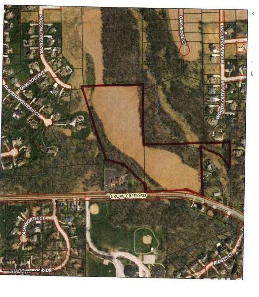 Prime residential development on Crow Creek Road and adjacent to settlement at Pigeon Creek Subdivision. Bounding survey to be completed with cost to be shared 50/50 with Buyer. Buyer will be responsible for acquiring right of way to access property from end of Pigeon Creek Trail through two adjacent properties whose owners are agreeable. Sale is subject to rights of existing farm tenant. Final price to be determined by surveyed acreage. Sewer through property. Water and Natural Gas available.