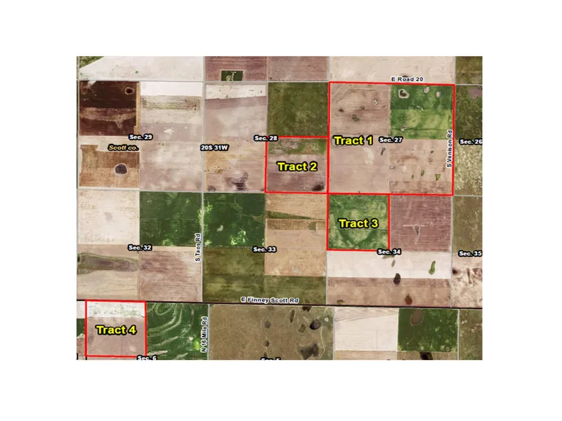 Tract 4 is a 1/4 section currently in wheat stubble and is located in Finney Co on the county line. Tract 4 includes a 4040 sf machine shed with a concrete floor that was originally for grain storage and is located approximately 1.5 miles from Tracts 1-3. Tract 1 has corn on the NE quarter, milo on the NW quarter, wheat stubble on the SW quarter and wheat stubble and milo on the SE quarter. Tract 2 is planted to corn. Tract 3 is open and the buyer can plant wheat this fall.Buyer will need to reimburse seller for sprayings and tillage on any wheat stubble.
