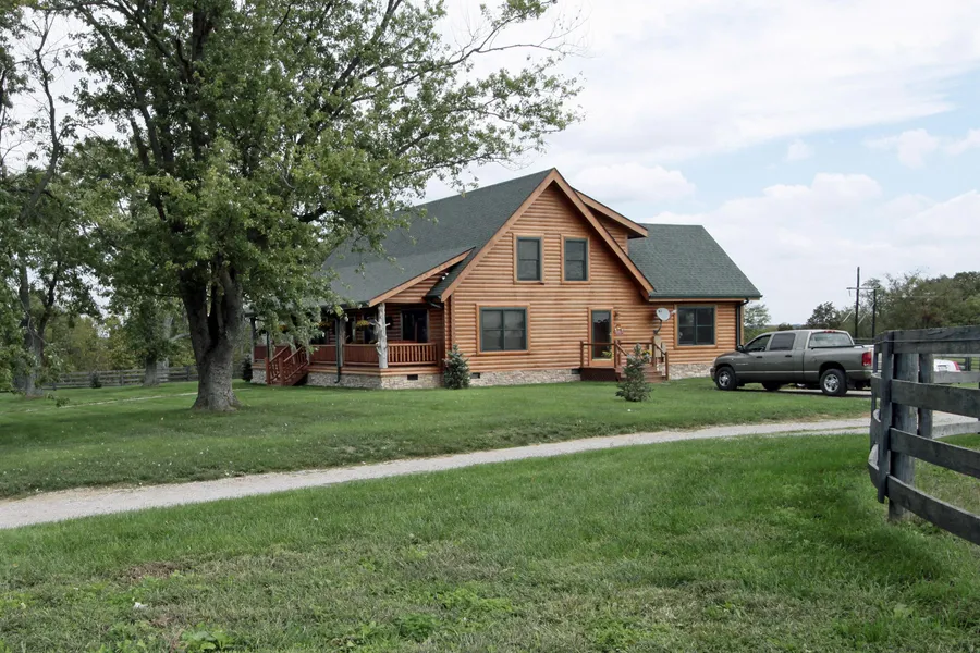 Breathtaking Bluegrass Farm - perfect for horses with 1/2 mile jogging/galloping area - great for legging horses up, good footing and good soil. Woods along side would make excellent riding trails, great for horse's minds - gives them a break from event training, round pens, etc. Property also offers a gorgeous, quality built, Anthony log home with 3 BRs, 2 1/2 BAs and approx. 2500 sq. ft. and loaded with exceptional amenities, also offers a metal barn with hay and tool storage and a run in shed in one paddock. Almost 3/8 of a mile of creek frontage on Elkhorn Creek. A true - Bluegrass Beauty!