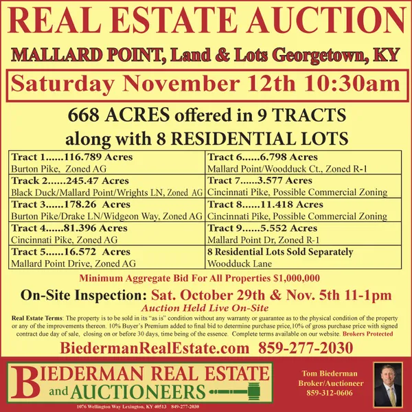 Real Estate Terms: The property is to be sold in its as is condition without any warranty or guarantee as to the physical condition of the property or any of the improvements thereon. 10% Buyers Premium added to final bid to determine purchase price,10% of gross purchase price with signed contract due day of sale, closing on or before 30 days, time being of the essence.