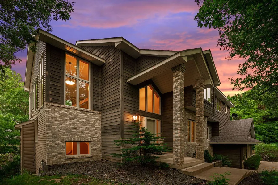 Beauty and nature await you! This incredible custom home is set on over 3 private, wooded acres. Living room features two story floor-to-ceiling windows with an abundance of natural light. Open concept kitchen walks out to spacious, double-tiered deck surrounded by nature. Upper level bonus room is the ultimate home theater space and is completely wired for surround sound. Master suite is custom-designed to maximize the views of the tree tops and Minneapolis skyline. Master bath features double-sided fireplace, large dual-head walk-in shower and generous walk-in closet. Walkout lower level includes family room with wet bar, guest room, sauna and large storage space. 4-stall heated garage.