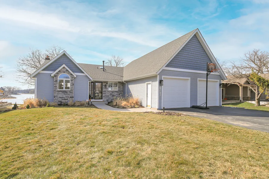 Beautiful "Big Water" panoramic views and special sunsets with west facing lot. Walkout from the Family/Amusement level to a gradual slope towards the lake. Sandy shoreline with newer boulder wall. Newly updated kitchen with gas range, center island and breakfast counter. Informal dining on same level. Completely remodeled primary bath right off the primary bedroom with separate tub and shower new vanity and walk in closet. Watch the special sunsets and socialize with friends on the main level deck, completely redone in 2021 with composite material. 2 Fireplaces, main level laundry, 3 car garage with drive thru door facing the lake for all your lake toys. New landscaping in front in 2023. New furnace and AC in 2022. Ready for you to enjoy immediately from your first day.