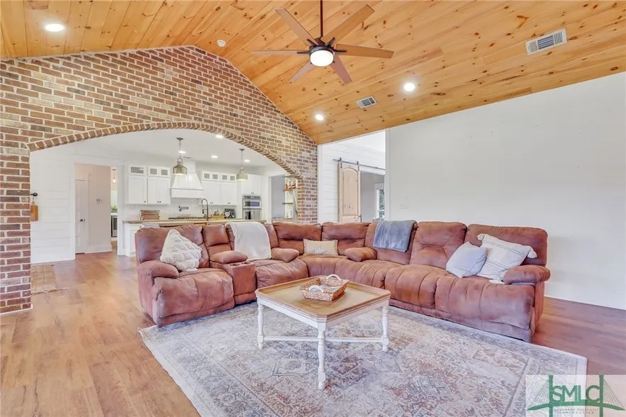 This custom-built home sits on just over 5 acres and offers a spacious, open layout with exceptional craftsmanship throughout. The two-story foyer leads into a large living area with a striking brick fireplace, vaulted ceilings, and built-in shelving. The kitchen is a chef s dream, featuring stainless steel appliances, a farmhouse sink, an island, and concrete countertops, while the adjoining breakfast nook and formal dining space provide ample room for entertaining. With a split bedroom floor plan, this home includes 5 bedrooms and 4.5 baths, including a master suite with a tiled shower, soaking tub, double vanity, and an oversized walk-in closet. The large screened porch extends the living area, overlooking the expansive backyard. This home is filled with custom features that make it stand out from the rest.
