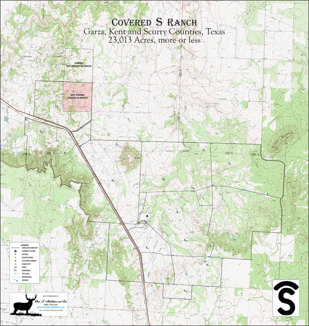 Water: The Covered S Ranch is considered to be very well watered. Principally, livestock and wildlife water is provided by numerous windmills, nearly all equipped with large water storage reservoirs. There are approximately 27 dirt tanks scattered through the ranch and several live springs. Additionally, several electric water wells are located near the headquarters improvements.