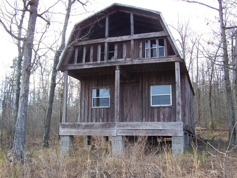 Hunting cabin on 10 acres for sale in the central Arkansas Ozarks. Cabin has 576 square feet contained in two floors of living space. To get to your deer stand just go up to second floor and step out onto a small covered deck. Sit down in an easy chair and look straight ahead for 500 feet of open shooting lane to pond. This is easy hunting. Hurricane Creek is a year round creek which flows across the northeast corner. Easy access off paved road. Quicksilver (Searcy 393) crosses the northeast corner also and the access road on the property goes to the front door of cabin. The cabin sits on the south boundary of property on a hill looking north with good views of surrounding land. A private getaway to enjoy the Ozarks of Arkansas!!