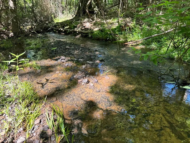 The property is predominantly covered in mature hardwoods and includes a seasonal wet-weather creek that winds through the landscape, enhancing the natural beauty and offering excellent wildlife potential.