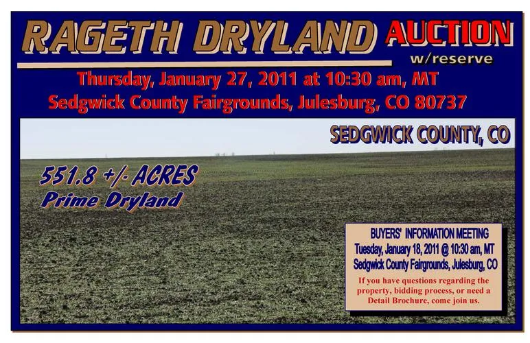 Colorado Farm Land for Sale - Prime Dry Farm Land - RAGETH DRYLAND AUCTION w/reserve - The Colorado farm for sale is some of the most productive farmland in Northeast Colorado. The Rageth land auction will be Thursday, January 27, 2011 at 10:30 am at Sedgwick County Fairgrounds, Julesburg, CO. Once this rural property sells, it may not become available for sale for years to come or never again.