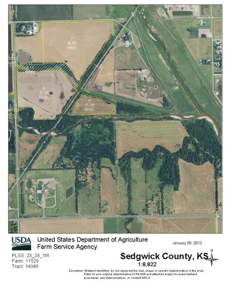 62 acres with 48 acres of cultivation. Balance lots of trees. This property lies adjacent to Cowskin Creek. Excellent habitat for deer and turkey. This would make a great place for a family getaway for hunting, camping and other recreational activities. One can probably find some arrowheads as the Chisholm trail was right to the west of this property. Hoover Rd. is blacktop so access is excellent.