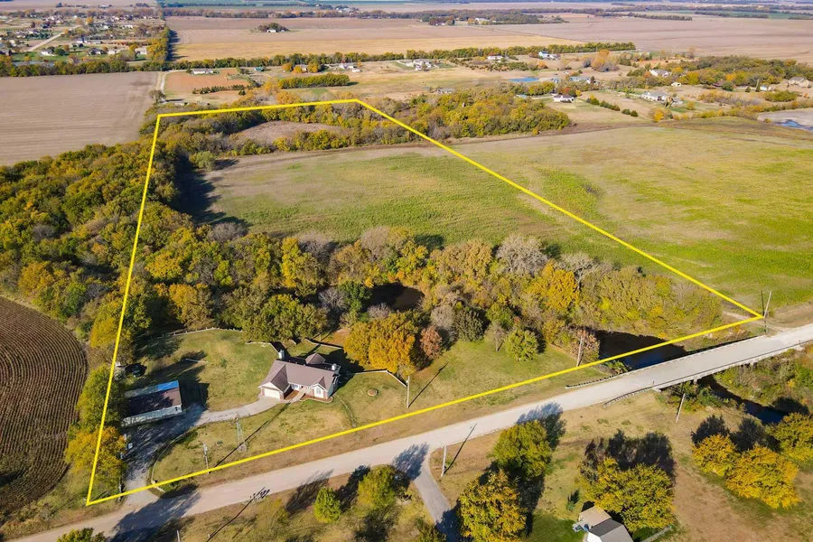 NO MINIMUM, NO RESERVE!!! ONLINE ONLY!!! Great opportunity to purchase a quiet country home on over 23 acres with a creek, all just 10 minutes from Wichita! This 3,943 square foot home offers 4+ bedrooms and 3.5 bathrooms with a finished walk-out basement. The exterior includes an attached 2-car garage and a 3 car detached garage/shop with a 4-car carport! There is a silo for additional storage and a fenced-in pen for animals. Don't miss the huge back deck that extends the whole length of the home and overlooks the country view. There are two sets of spiral staircases that lead to the covered, lower-level patio. This home is absolutely perfect for entertaining guests!
