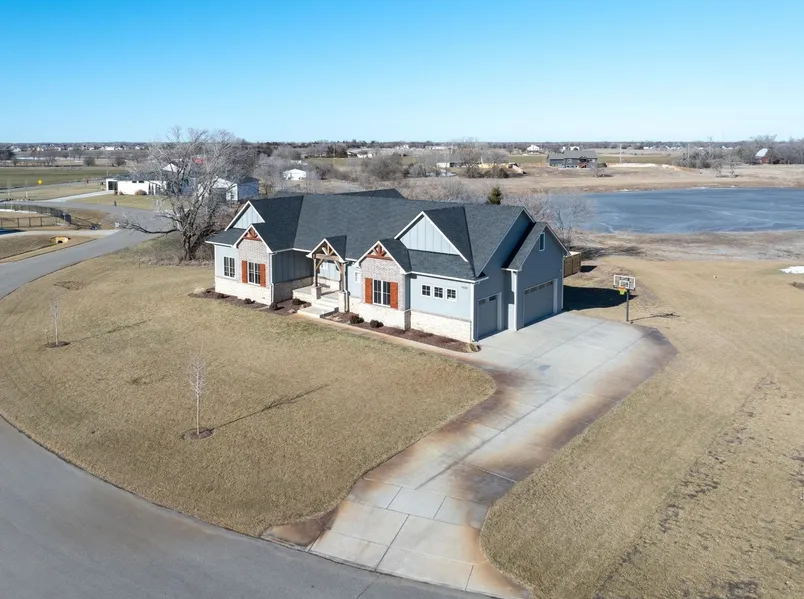 Imagine yourself living the dream of country lakefront living! Nestled in the peaceful Cherese Woods neighborhood of southwest Wichita, this stunning property offers the best of both worlds. With a private 2.1-acre lot directly on the lake, you'll have water views to cherish every day. Cast a line, explore the lake in a boat, or simply soak up the tranquility – it's all right there at your fingertips! Need a space for your hobbies? There's plenty of room to add a garage or workshop and make it your own. This beautiful home, built in 2021, is your own private oasis. Spread out in over 4,180 square feet with 7 bedrooms and 4 full baths, ensuring everyone has their own space. Unwind in the finished room above the garage, complete with a walk-in closet and full bath, perfect for a guest suite or a home office with a view. Step outside and take a dip in the sparkling in-ground pool, the perf...