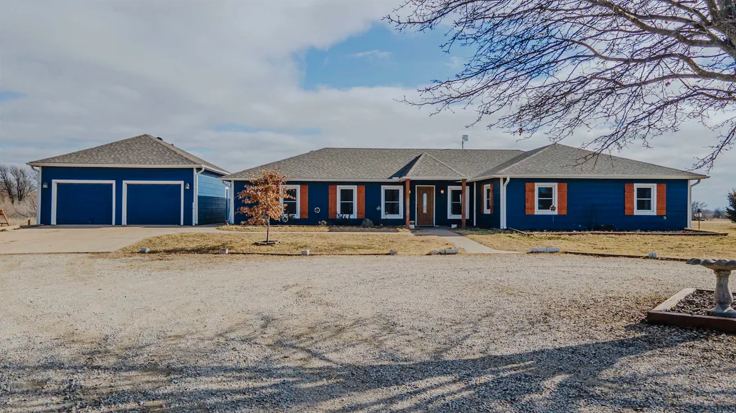 Nestled in the serene countryside of Cheney, KS, just minutes from Lake Afton with quick and convenient access to Wichita, this spacious 4-bedroom, 2-bathroom home offers the perfect blend of privacy, comfort, and functionality. Situated on 5.65 picturesque acres, this property features a beautifully landscaped front yard with open space for pasture, gardening, entertaining, while the back half is a wooded retreat, ideal for nature lovers. Built with insulated concrete form (ICF) construction, this 2,389 sq. ft. home is designed for energy efficiency and durability. Inside, you'll find a split-bedroom floor plan with an inviting atmosphere, enhanced with updated engineered hardwood flooring, large windows showcasing scenic views, and a cozy wood stove in the family room. The spacious kitchen offers the perfect space for cooking and entertaining, featuring quartz countertops, abundant cabinetry, and two pantries. The master suite offers a true retreat, complete with a walk-in closet, a spa-like ensuite with a jacuzzi tub, and a tiled shower. Enjoy the outdoors year-round with a screened-in porch, perfect for morning coffee or evening gatherings. The property also boasts a temperature-controlled oversized 2-car detached garage; perfect for that hobbyist and a spacious and versatile pole barn offering plenty of room for extra tools. Whether you are entertaining or need a great space for the kids to play, the property also includes a volleyball net, an expansive playground, and a dog run/chicken coop for the fur kids! Additional highlights include a reinforced concrete storm room, offering unmatched safety and peace of mind during Kansas storms, and a spacious, separate laundry room designed for convenience and organization. Recent 2022 updates include a brand-new roof, fresh interior paint, and stylish engineered hardwood flooring, enhancing both the home's durability and aesthetic appeal. Located less than a mile off black top this secluded yet accessible property is a rare find—schedule your private showing today and experience the tranquility of rural living!