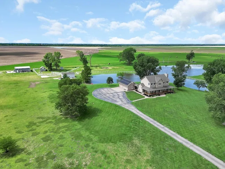Discover peaceful rural living on over 8 scenic acres, complete with a large, tranquil pond and a charming wrap-around covered porch that offers picturesque views of the water and countryside. The property offers a second guest house perfect for multigenerational living or additional rental income! This beautifully remodeled main home features 5 bedrooms and 4 bathrooms and has been freshly painted and new flooring throughout as well as new appliances. With an abundance of windows, the main floor living area is spacious, airy, and features two separate dining areas, an eating bar, a large family room with a cozy wood burning fireplace and main floor laundry! Upstairs the primary suite offers a double vanity, jetted tub, shower, and a large walk-in closet! Three other nice sized bedrooms and an additional bathroom complete the upper floor. Downstairs features another family room with an additional fireplace, an additional bedroom with ground floor entry, a bonus room, an additional bathroom, and tons of storage! The home has a reverse osmosis system and solar panels reducing utility costs significantly! The newly built guest home offers 2 bedrooms and 1 bathroom and is complete with granite countertops and modern appliances. An additional outbuilding provides ample storage or space for hobbies, and the property is horse-friendly, offering plenty of room to roam. This one-of-a-kind property blends privacy, versatility, and comfort perfect for those seeking a rural lifestyle with modern conveniences. With easy access to K96 this home is minutes away from NW Wichita.
