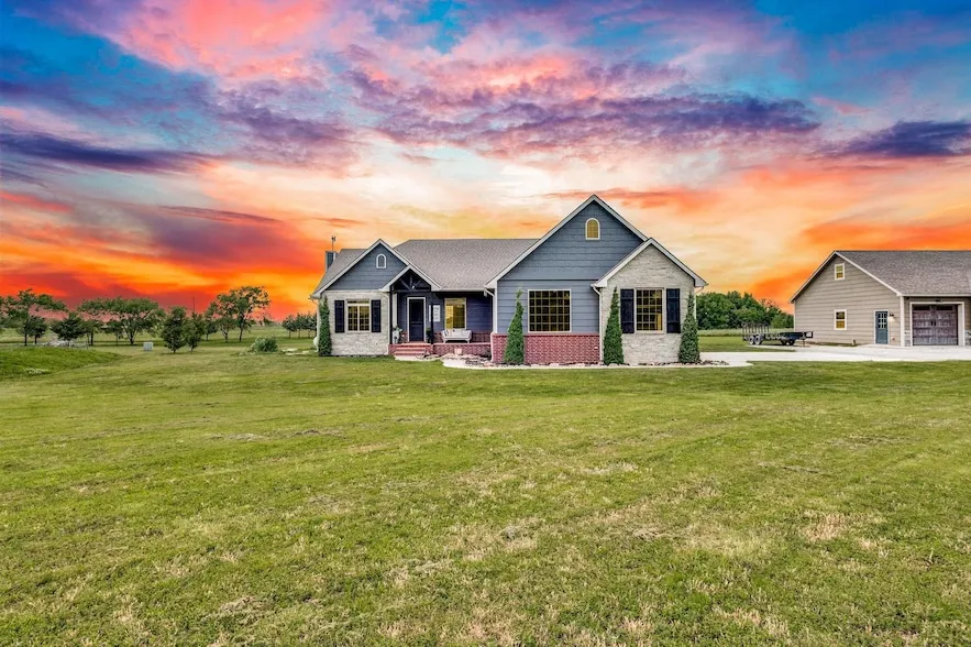 Your dream home is finally here! Offering the peace and space you ve been looking for, this property gives you your own slice of paradise on five acres in Derby, with the added perk of being in the Rose Hill School District. Pull into the half-circle drive and instantly feel at home. There's an attached two car side-load garage, a detached three car garage, and plenty of space for RVs and trailers. The partial brick and stone exterior adds beautiful exterior appeal. Step inside to an inviting entry foyer with a beamed tray ceiling that sets the tone for the elegance throughout. The living room is filled with natural light from a wall of picture windows and centers around a stunning stone fireplace. It's fully open to the kitchen and dining area, making it ideal for gatherings of any size. The dining room sits in front of sliding glass doors that lead to the patio, and the kitchen is pack...