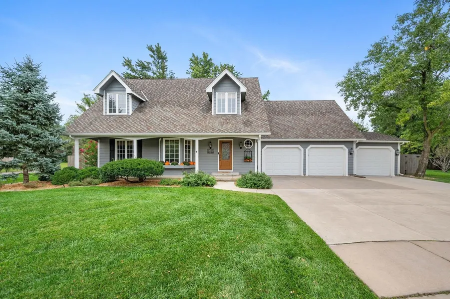 Welcome to this gorgeous 2 story home that has a French- Cottage feel, with 2nd Story dormer windows, and an oversized 3 car garage. The home is tucked back into the highly sought after Waterford Addition, located close to the best restaurants and shopping that Wichita has to offer near Bradley Fair. The main floor offers 1,034 square feet of open floor plan and pure entertainment space. When entering the home, notice the laminate wood flooring through the living and formal dining room areas. The formal dining is located directly off the entry way and is very spacious, allowing for a large dining room table and other furniture pieces. The dining room offers a large built-in kitchenette situated on the back wall, its beautifully designed with upper and lower cabinets and drawers, and a built-in wine rack. There is also an island with a beverage refrigerator, and all counter surfaces are granite. This custom built- in is incredible and adds character to this space allowing for extra storage and function. The dining room opens nicely to the kitchen that offers amazing upgrades such as a large eat-in island, granite counter tops, gas stove with electric oven, stainless steel hood vent, composite sink, an extra eat-in space for a small table in the bay window area, and roll out pantry drawers. The kitchen and beverage refrigerators stay with the home. This overall design compliments the home and feels inviting. The kitchen opens to the living room offering a beautiful gas fireplace for cozy nights and a large living space for several pieces of furniture. There are nice windows and a French door that leads to the back deck, opening to the yard and flower garden area. The yard offers a beautiful landscaped garden with blooming flowers and tall Juniper trees, there is also a nice sized green house, raised garden beds, and the planter pots and large fountain will stay with the home. The main level also offers a guest 1/2 bathroom and laundry room. The upstairs offers 1,280 square feet for spacious sleeping quarters with 3 separate bedrooms and a large Master suite. The Master bedroom is beautiful with tall vaulted ceilings and large walk-in closet. The master bathroom offers a double vanity with a newer tiled floors, backsplash and granite countertops. The tub/ shower combo has a nice tiled surround that is modernly updated. Downstairs is a nice sized family room with updated LVP flooring, recessed lighting, and the pool table stays with the home. There is also a work room with a plumped in sink and an extra storage room. The home also offers an oversized 3 car garage with show room flooring and a built-in over head heater. The metal shelving in the garage stays with the home. This home is just perfect for your family. It is evident the sellers took immaculate care and paid close attention to detail. Don't miss the opportunity to see this one.