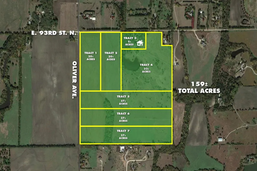 If Tracts 1-7 are purchased separately, buyers must comply with all Sedgwick County requirements regarding a lot split. Taxes on the individual parcels will be estimated at closing as final amounts will not be available until such time as the lot split is finalized.