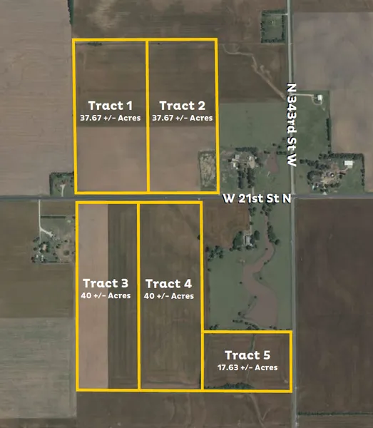 Live and Online Bidding. Friday, June 21st at 11am, Held at 4105 N Ridge Rd, Wichita, KS (American AgCredit Bldg). This 172.97 +/- acres is being offered in 5 tracts BY CHOICE. This is an exceptional opportunity to own prime land in Sedgwick County, Kansas near Cheney Lake, KS! Whether you're looking to build your dream home or invest in quality land, this auction is not to be missed. The real estate taxes are TBD as the tracts are part of a larger parcel. The exact and final acreage amounts for the tracts shall be determined by the current survey or by a survey to be provided by the Seller at the Seller's expense. If additional survey work is required, the Seller shall have it completed prior to the closing date. The total final purchase price for the tracts shall be calculated based on the total gross surveyed acres as determined by the current or newly performed survey. We will offer tracts 1 through 5 by choice.
