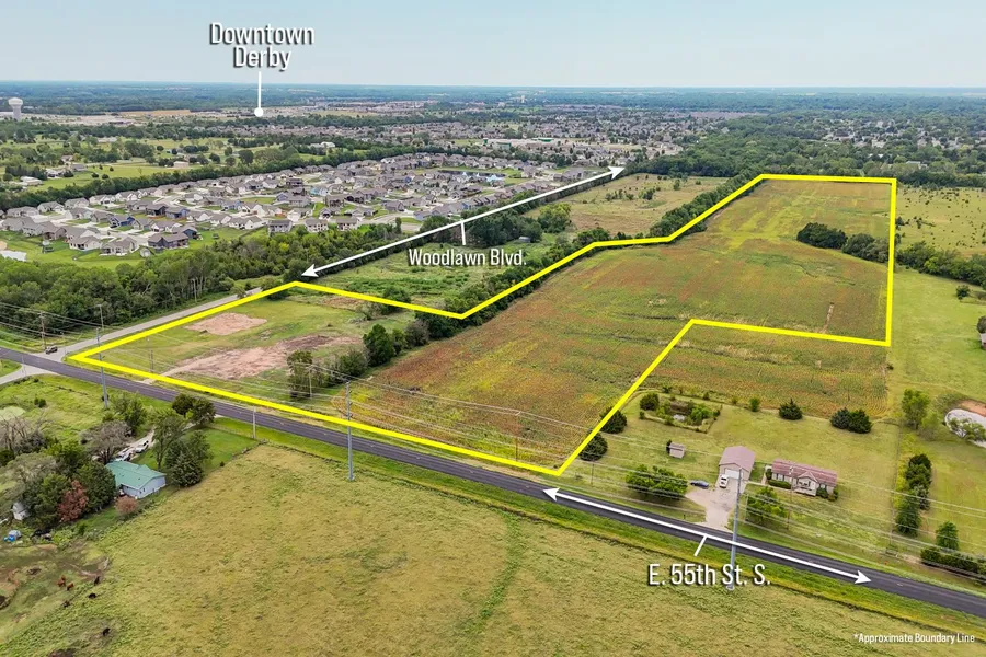 ONLINE ONLY!!!WOW!! This is the opportunity you have been looking for! 30+/- Acres of ground ready for development, located in Derby, on the Southwest corner of E 55th St. S. & Woodlawn.