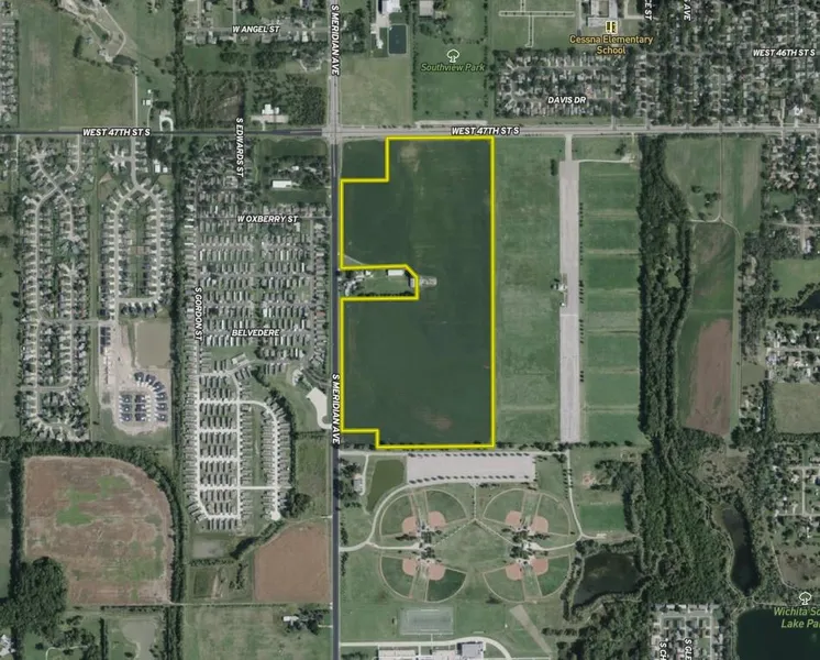 Location: Conveniently located less than two miles south of the I-235/Meridian interchange and two and one-half miles west of the I-35/47th Street South interchange, where access to the Kansas Turnpike is also located. The City of Haysville is less than two miles to the south. YMCA South, a Wichita library branch location, and a police/fire station are located less than two miles to the north. Within the same section as this property is South Lakes Park, where there are 240 acres with football fields, a softball complex, fishing lakes and open spaces. The design work for a 24-court Pickleball complex to be built at South Lakes Park has been completed. South Lakes Park is adjacent east and south.