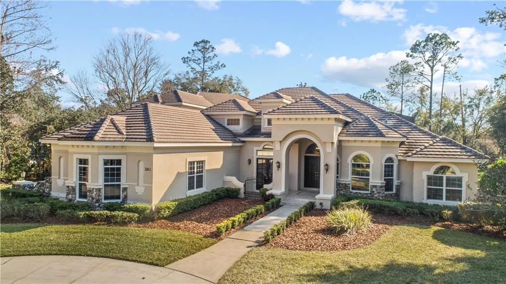 This beautiful custom built, Dave Brewer home is situated on over an acre in the guard gated community of Heathrow Woods. Featuring 6 bedrooms and 4 bathrooms, this home also boasts a large convenient in-law suite with separate laundry and kitchenette. Energy efficient in mind - 3 zone A/C SEER 17, R30 Insulation, double pane windows with UV tinting. Property was recently painted inside and out and new carpet added. Open floor plan that is highly functional featuring impressive designer touches throughout such as tray and coffered ceilings, archways, crown molding, plantation shutters, recessed lighting, built-ins, niches and so much more! Impressive formal living room with a huge seamless glass window giving views of the sparkling pool. Large 36x19, gourmet, eat-in kitchen complete, walk thru butler pantry, island, breakfast bar, stainless steel appliances and overlooks the family room....
