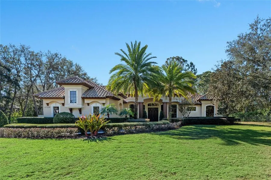 STUNNING custom built home on 1.12 acres in the very desirable gated community of Carisbrooke! This exquisite 4 bedroom PLUS office, POOL home truly has it all. Some features include travertine & wood flooring throughout, custom blinds, crown molding, BEAUTIFUL tray ceilings. The open kitchen is a DREAM with an attached Butler's pantry including a wet bar, wine cooler, stunning wrought iron detail, large kitchen island, granite countertops, stone backsplash, stainless steel appliances PLUS a double oven, custom refrigerator and a hidden walk-in pantry! Double sided gas fireplace between living room & kitchen. Luxurious Primary Suite with a sitting area, his/her custom closets, oversized master bath w/jetted tub, walk in shower & detailed cabinetry. The Bonus Room off of the Family Room has an adjoining bedroom & bath which can be used as a separate suite! Work space area perfect for homework/hobby is conveniently situated near the secondary bedrooms. The two sets of sliding glass doors overlook the breathtaking oasis in the backyard which includes pebble tec inground pool & spa with stone waterfall, paved lanai, built in summer kitchen with gas grill and sink. Three car garage, private side entrance with bench seating. The outside has fabulous curb appeal with beautiful trees and landscaping. Great location with easy access to restaurants, shopping malls, I-4, and SR 417
