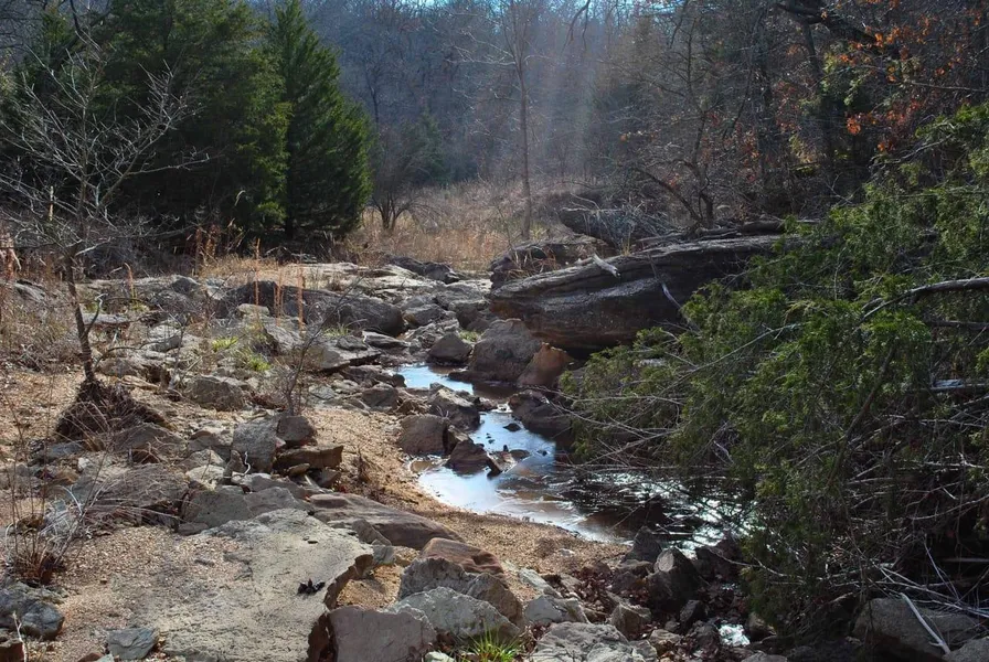 Water is always a big attraction. This property has six existing ponds. One is approximately 2 acres and has a nice island and duck blind. An unfinished walkway connects the shore to the island and only needs floorboards and railing to finish it out. Two other ponds are a little larger than an acre each. They also each have fishing docks and one has a duck blind. There are two other ponds that are slightly larger than 1/2 acre each and one small pond is located along the driveway. There are also two brand new ponds that have been built on the property in the eroded area east of the house. We don't know how large these two ponds will be when full, but our guess is that the larger one will be close to 2 acres while the smaller one will be about an acre. Regardless of their size, we think transforming a badly eroded area into two new ponds is a great thing, especially when it addresses the last of the actively eroding areas on the ranch. The existing ponds are stocked with bass, crappie, perch and catfish and will be the ideal place to make some memories with the kids and/or grandkids this spring and summer. But there is more to water than just fishing. There is nothing more fun to kids than exploring creeks, flipping rocks, looking for arrowheads and splashing in the water. This property has an ideal stretch of a creek in its southeast corner that would be the perfect spot for this kind of exploration. It doesn't run all the time but tends to keep pools of water and has a nice rock feature that creates a small waterfall after big rains. There is also a more rugged drainage in the southwest corner of the ranch. The elevation in this area quickly transitions down about 30 feet from the top of the ridge down into the bottom of the drainage. The slopes of this drainage have lots of large boulders including one large rock slab that tilts upward and extends to the east. There appears to be a spring in this drainage, and we will be exploring it to verify as soon as possible.