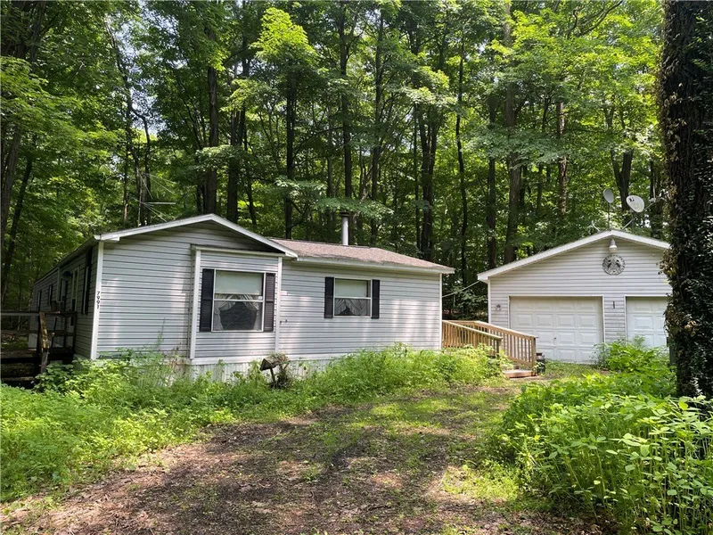 Handyperson special in beautiful scenic location outside of Ovid. 1988 manufactured home has two smaller bedrooms plus a large primary suite with dual vanities, garden tub, and stall shower. Second full bath has full size tub/shower. Two generous size living rooms plus an elevated dining area alongside the kitchen. Oversize two car garage for plenty of extra storage. Densely wooded lot with Sheldrake Creek flowing along one side. Tons of potential here to make this your country oasis.