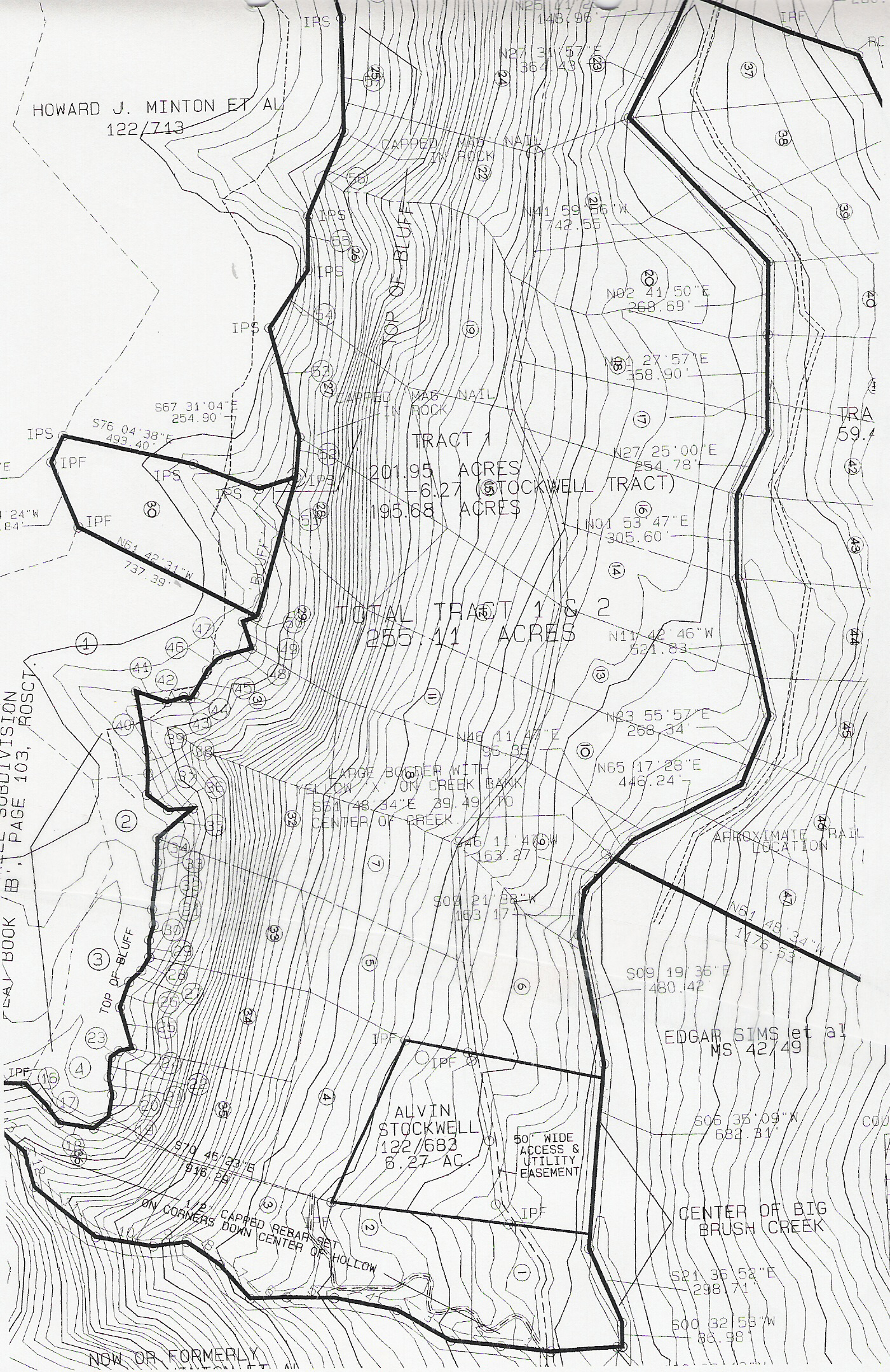 This is wooded property on a private road just out of town. It is secluded with lots of timber and a large creek. The road runs above the creek and there are multiple home sites. It has lots of wildlife, large stone features and wildflowers. It can be divided. 88 additional acres are available on another tract. There are homesites just under the bluff with miles of views. There are many homesites in the middle of the property and you could do 10 or more creek side lots. There is also 59.43 acres across the creek for $125,000
