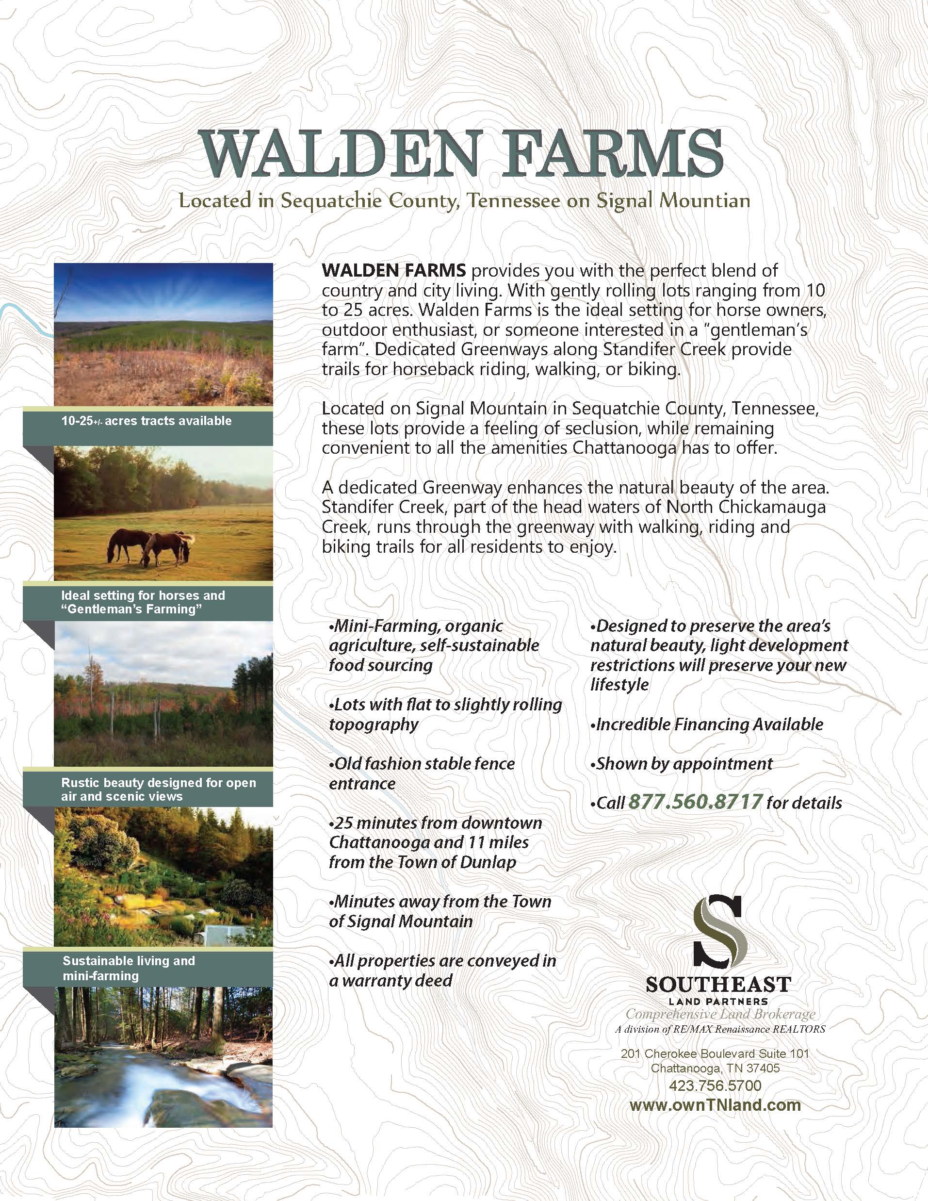 Research Parcel InformationFrom Chattanooga take Hwy 27 north to the Signal Mountain exit, proceed north on Hwy 127 go up Signal Mountain and continue on Hwy 127 until you see the sign for Walden Farms on the right. Property is gated please call John Hetzler 423-313-5457 for a private showing.