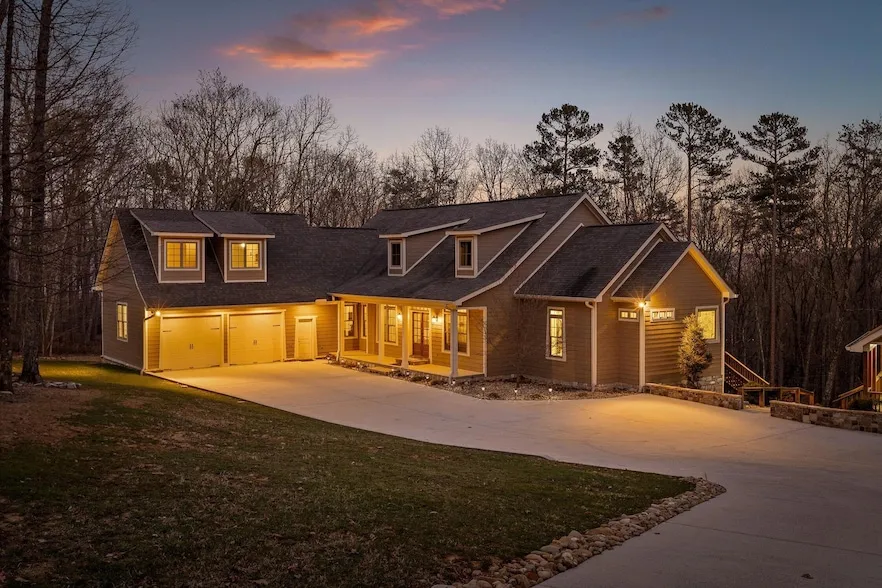 Nestled in nature's serenity, this breathtaking estate blends elegance and tranquility on four secluded acres. The stunning main home features soaring vaulted ceilings, expansive double windows, and doors that open to a sprawling back deck blurring the lines between indoor comfort and outdoor splendor. Step through grand double doors into a refined sitting room on one side and a bedroom suite on the other, leading seamlessly into a sunlit living area. A majestic stone fireplace stretches from floor to ceiling, creating a warm focal point, while the screened-in porch offers a peaceful retreat overlooking the mountainous backyard and adjacent deck. The kitchen and dining area boast custom cabinetry, a large island, and high-end appliances, including a wall-mounted oven and warming drawer. Off the dining area, a charming sunroom invites you to bask in natural light year-round, offering a tr...