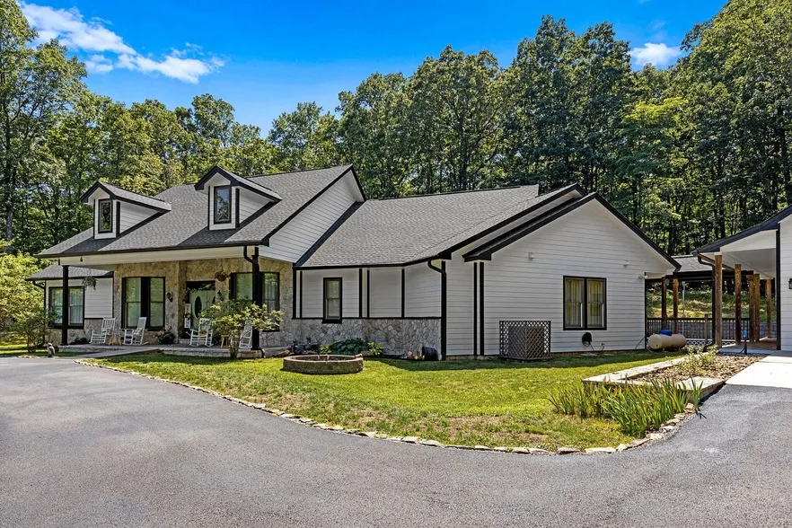Nestled with the pristine Fredonia Mountain Nature Resort, 157 Twilight Trl is more than just a home - it's a private sanctuary. Spanning 7.07 acres this property offers both serenity and boundless potential. *Over 10 acres of adjacent land for purchase* Located in the gated community, the home is a spacious 4 bedroom 4.5 bath retreat with it's own Private Entrance Suite (bedroom 4/bath 3) with mini-kitchen, great for relatives or visiting guests. The Suite has its own thermostat. You'll enjoy the stacked stone fireplace with/gas starter and blower for those chilly nights. French doors lead out to the screened-in porch with room for entertaining. For those cooler days when you don't want to run the A/C, the Whole House Attic Fan will bring those outside temperatures in. All on one level with the exception of a heated/cooled (wall unit) teenage/guest/office suite over the garage with full bath (bath #4) which includes a built-in desk and walk-out attic storage. A new HVAC(heat pump) unit was installed in 2020 and a new roof with architectural shingles in 2022. The 2 car detached garage, accessed by a covered breezeway, includes ample storage. Walk through the door in the back of the garage and you'll find a custom workshop with a utility sink and radiant floor heating. There is a separate building with electricity next to the garage for additional storage; a golf cart or UTV space is attached. The house is secured with a Front Door ''Ring'' doorbell, outside cameras with monitoring and wireless alarm system. 42'' encapsulated crawl space with humidity control, Anderson windows and doors. The home has 220 volt wiring with a separate panel for a home generator. The home is nestled among a 3,500 acre resort called Fredonia Mountain Nature Resort, which makes up 5 distinct gated neighborhoods with a staffed security office at the main resort entrance.