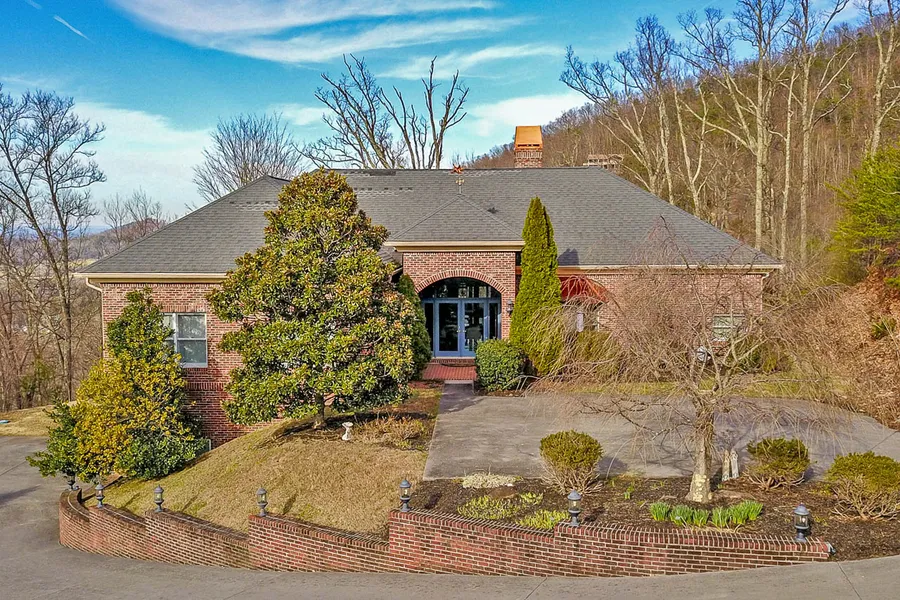 Savor a low-maintenance mountain lifestyle in this all-brick custom home on 8.74 acres overlooking a magnificent view of Wears Valley. A gated entrance leads through professionally landscaped grounds to paved parking on two levels. The main entry opens into a foyer/formal living room with trey ceiling, gas log fireplace, and access to the oversize screen porch. A short hallway takes you to the great room, which brings the kitchen, family room, and breakfast nook together under a cathedral ceiling. Luxury touches abound in this space, from the 16' domed windows to the custom kitchen with lighted display cabinets to the Trex-floored outdoor balcony. The adjacent formal dining room has a large picture window to enjoy the vista. Another hallway leads to 2 bedrooms that share a full bath, and the laundry room. At the other end of the home is the sumptuous master suite: a huge bedroom with trey ceiling, fireplace, and bay window sitting area, a dressing room with vanity and walk-in closet, a water closet, and a bath area with jetted tub, step-in shower, and dual vanities. A home office with bay window rounds out the main level. Downstairs is a 2-car garage with workbench and utility sink, as well as a large unfinished space (with outside entrance) that could be finished as additional living space, an in-law suite, or a tremendous home theater. This architect-designed home was built using premium materials including Marvin Windows, Mannington & Karastan flooring, and KitchenAid appliances for lasting comfort and value. Sitting on 4 land parcels for privacy and view control, the loudest sound here is the singing of the birds and the wind in the trees - schedule a personal visit today to find your private haven in the Smokies!