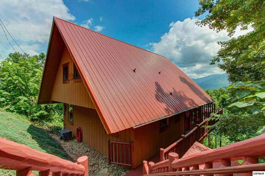 A gorgeous view of the Smokies is the backdrop for this handsome cabin in Chalet Village. The great room is the heart of the home, with a woodburning fireplace, wall of windows for the view, and the warmth of natural wood all around. The kitchen sports stainless appliances, a breakfast bar, plenty of cabinet space, and a handy washer/dryer closet. A bedroom and shared full bath round out the main level. Upstairs the spacious master has a cathedral ceiling, lots of windows, and a private balcony overlooking the national park. It shares a full bath Jack & Jill-style with the rec room, which has a pool table and full wet bar. The final highlight is the exceptional main-level deck with a hot tub and sitting area with firepit table and TV that can be selectively shaded by two large power awnings with built-in lighting for nighttime entertaining. This home is just 10 minutes from downtown Gatl...