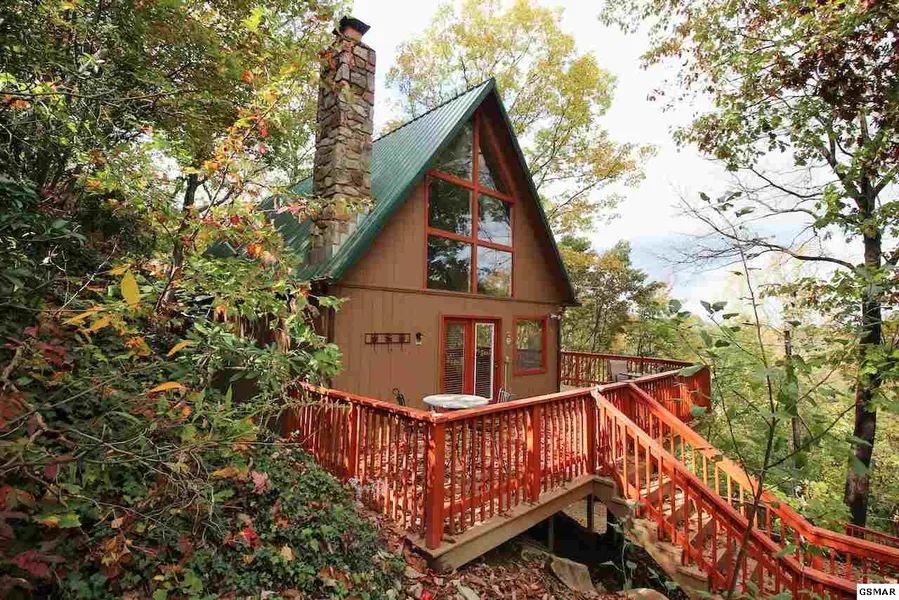 Beautiful 2 bedroom 2 bathroom chalet nestled in Chalet Village with a lovely Mountain View and serene woodland privacy. Heading up towards the front door you are met by a wonderful deck space that wraps around to a covered hot tub area. Entering the chalet the tall ceilings with exposed beams and stone fireplace immediately catch your eye creating a warm and inviting space. Passing through the kitchen from the living room/dining room combo you find a bedroom, bonus room and a full size bathroom. The master bedroom and 1 more full bathroom are up stairs featuring a walkout deck area that leads back around to the covered hot tub and wrap around deck. Located at the end of a quite dead-end street with just a few houses, seclusion and serenity await. Close to the National Park boundary line with abundant wildlife, private gated drive, less then 1 mile to the neighborhood pools and about 2 miles to downtown Gatlinburg. It's a perfect location for a mountain retreat while being close to action of town and the beauty of the park. Schedule your showing today!