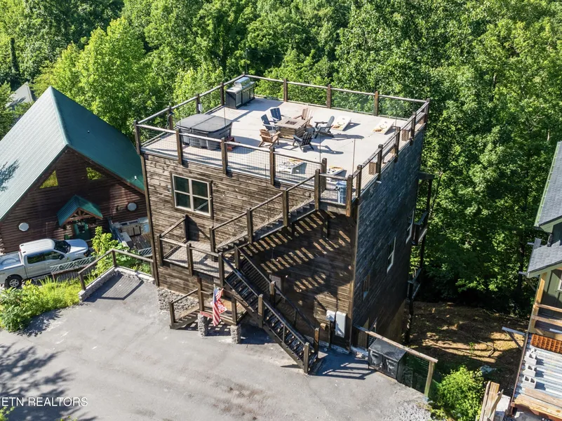 **Home will be freshly stained in January 2026!!** Welcome to your dream get away! This income producing home offers the perfect blend of modern luxury and relaxed comfort. You will be amazed immediately upon entering this fully furnished contemporary built style cabin. The tastefully designed kitchen/dining area opens up to the main living room that features both a fireplace and TV where you can gather and make memories with loved ones. Then you can head to the rooftop deck for plenty of activities or simply some quiet time to soak in the hot tub and take in some stargazing on clear nights or just be mesmerized by some of the best views that East TN has to offer! You are just short minutes away from all of Pigeon Forge's main attractions and shopping! Or take a short drive to Gatlinburg and the Great Smoky Mountains National Park to do a little hiking and maybe enjoy a picnic by the river. Some Features this home has to offer: 4 bedrooms (Primary on the main opening to the deck) 4 full bathrooms. Private Pool Room (with half bath). Laundry Room (with a half bath). Outdoor Theater 2 gas Grills, Rooftop Firepit, Corn Hole Boards, Hot tub, Pool Table, Fully Furnished with all Appliances and Stunning Mountain Views! Buyers and agents to verify all info.