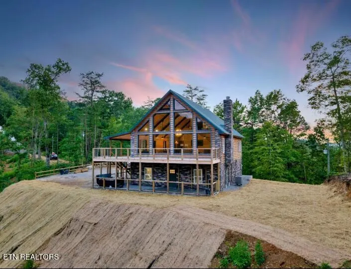 WOW FACTOR WITH VIEWS FOR MILES FROM THIS TOP PERFORMING 3BR WITH BONUS ROOM MOUNTAIN MODERN LUXURY CABIN! THIS WELL-APPOINTED AND DESIGNED LODGE WITH OUTDOOR SPACE IS SETUP WITH AN AMENITY PACKAGE BUILT TO STAND OUT. This well-designed cabin features three king bedrooms and a bunk room, providing flexible sleeping arrangements for larger groups. The main-level primary suite includes a king bed, private ensuite with a custom walk-in tiled shower and soaking tub, and stunning mountain views. Floor-to-ceiling windows flood the home with natural light and frame the surrounding scenery, creating an open and elevated living experience. The custom kitchen is fully equipped with high-end appliances, luxury granite countertops, and ample space for entertaining, complemented by multiple dining areas including a large family table and additional breakfast seating. The lower level is designed for enjoyment with a game room featuring a pool table, arcade games, skee ball, board games, and a smart TV, as well as a dedicated theater room with comfortable reclining seats. Outdoor living is a standout feature with double-level decks, generous seating areas, and a private hot tub overlooking the mountains. A peaceful river can be heard nearby, adding to the serene mountain setting. Additional features include smart TVs throughout, central heat and air, in-unit washer and dryer, and ample parking. This property offers a rare combination of luxury design, strong sleeping capacity, and high guest appeal in a premier mountain setting. Located only a short drive to Pigeon Forge or Gatlinburg, TN! Must see!