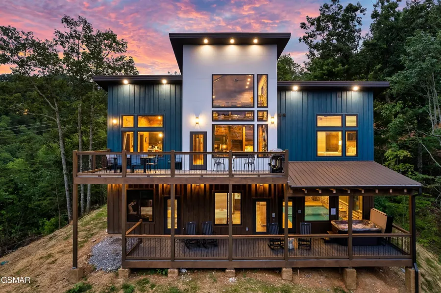 This modern mountain-style showstopper offers breathtaking mountain and valley views along with a rare indoor heated gunite swimming pool, intentionally designed to stand out in today's competitive short-term rental market. The spacious 12' x 24' pool includes a mini waterfall and a shallow wading area for small children, providing resort-style luxury that's also family-friendly. A striking wall of glass brings the outdoors inside, showcasing the surrounding natural beauty from multiple perspectives. Professionally curated finishes and furnishings create a true turnkey, worry-free investment. Hand-stained tongue-and-groove and alpine-sawn trim blend seamlessly with faux stone and smooth drywall for a warm, elevated look. The open-concept interior centers around a spacious great room with soaring cathedral ceilings, flowing into a stylish kitchen with bar seating and an adjacent game loft. The main level offers two large bedrooms with nearby full baths, while the lower level features two additional oversized bedrooms with private en-suite baths. A dedicated theater room and the climate-controlled indoor pool level complete the entertainment experience. Outside, low-maintenance cement fiber board siding, trim, and soffits are accented with wood board-and-batten details, providing both durability and mountain-modern curb appeal. Whether you're looking for a high-performing overnight rental or a fun-filled second home, this property meets every need. Convenient back-road access to Wears Valley and a location just minutes from Pigeon Forge make the setting as desirable as the home itself.