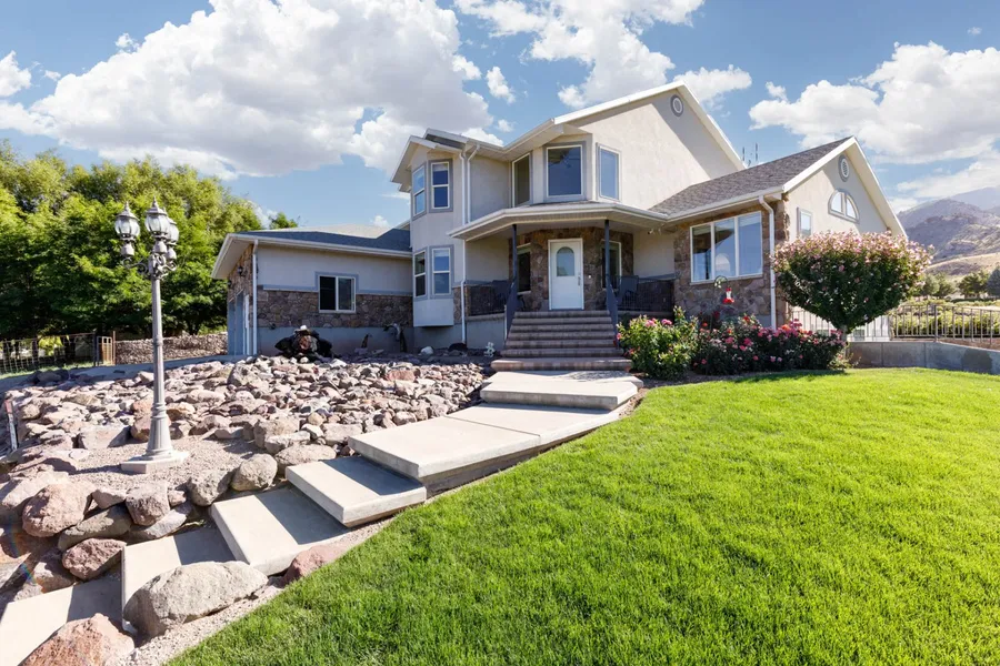 Tucked away on a private road, this impressive 5 bed, 3.5 bath home sits on 1.9 acres with mountain trail access for horseback riding. The main level primary suite features a private patio, jetted tub and separate shower. Built with 5/8 inch sheetrock for efficiency, this home keeps utility costs low while offering spacious, versatile living. The finished basement includes a full custom kitchen, media room and game room - with outside access, making it perfect for entertaining or additional living quarters. Outdoors, enjoy three patios, a cozy fire pit and a fully fenced, irrigated property with animal rights through Monroe City. An oversized garage, horse arena nearby and automatic sprinkler system make this property both functional and inviting. Lovingly maintained by the same owner for 21 years, this home blends comfort, efficiency and lifestyle - ready for its next chapter. Schedule your showing today!