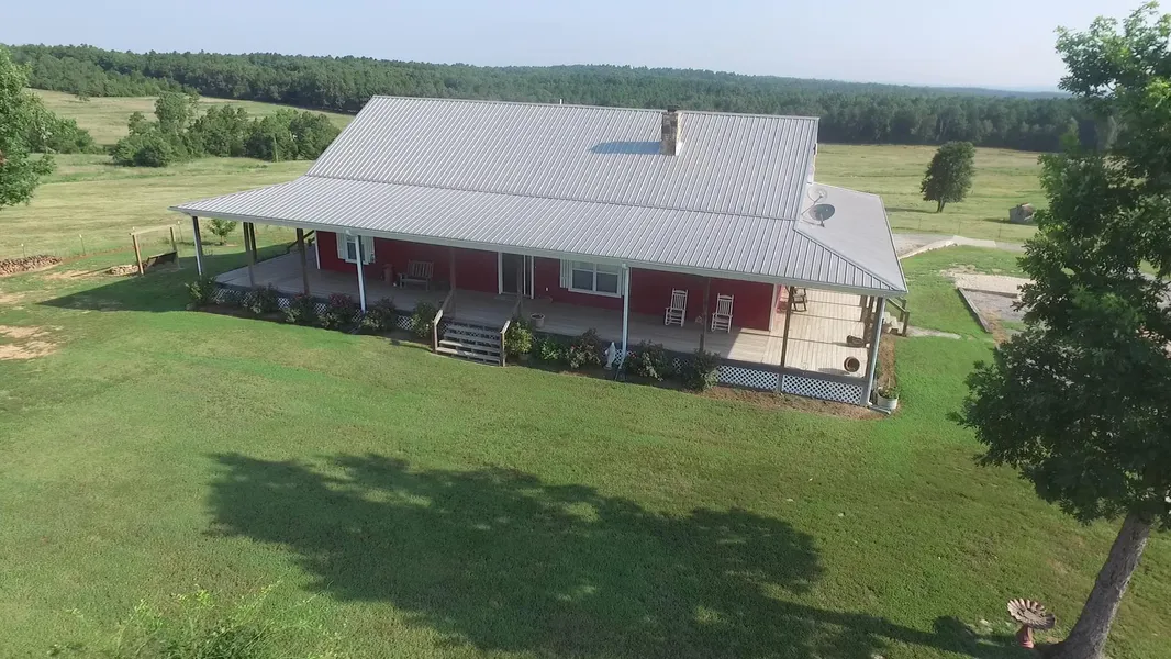 This ranch is located in the north central Ozarks Mountain region, just north of Batesville and Cave City, Arkansas. This is a very well maintained cattle or horse ranch with very productive pastures and barns. The home features a covered 10 foot porch that is all the way around the home. You can sit at the kitchen table and see all of your livestock grazing. There are two bedrooms upstairs as well as two full baths. The master bedroom has a beautiful tiled walk in shower, double vanities and a spacious walk in closet. The living room has a native stone wood burning fireplace with outstanding masonry work. The kitchen has custom built oak cabinets with lots of drawers for big pots and pans. The kitchen has a center island bar and a nice dining area. The home has all beautiful hardwood floors on the main level except for the baths and the kitchen which are tile. One important feature of t...