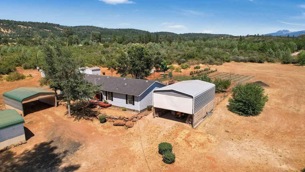 Discover this fantastic 4-bedroom, 3-bathroom manufactured home, set on a permanent foundation. Inside, you'll find vaulted ceilings, a cozy dining area with a woodstove, and a generously sized master suite featuring dual sinks and dual shower heads. Situated on 10.96 flat, usable acres, the property includes multiple outbuildings and carports, plus fenced areas ideal for chickens, gardening, or hobby farming. Enjoy breathtaking mountain views and wide-open space in every direction. Whether you're looking for a peaceful primary residence or a weekend retreat, this property delivers privacy, functionality, and tranquility in equal measure.